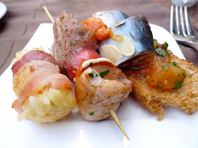 My second plate of goodies: Salmon with Mojo Sauce, Potato Tortilla and more *drool* Roasted Peppers and Almonds with Honey and Sardines. In case you didn't know...